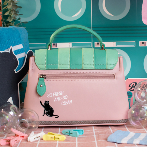 The Bubble Cats Laundromat Mini Grace Bag is a delightful accessory, loved by Vendulettes everywhere. A smaller version of the Grace Bag, it’s just as spacious, fitting all your essentials and more. You can carry it as a handbag or wear it over the shoulder, depending on your mood. Plus, it will always stay clean and stable on any surface, thanks to the base studs. Made from vegan leather, this pink and green bag, with its vibrant artwork.