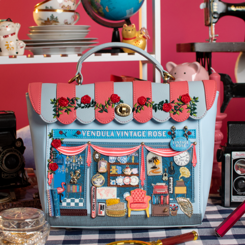 We’re bringing back an iconic bag shape! Get ready for the Vendula Vintage Rose Classic Backpack. This vegan leather accessory holds all your essentials in a spacious main compartment, with a secure flap clasp closure to keep everything safe. It has a comfortable handle and two detachable straps, so you can carry it as a handbag, over the shoulder, or crossbody. This blue backpack features charming artwork, including hand-stitched roses on the awning and a shopfront full of vintage treasures. Step inside and explore—you may find something you didn’t know you needed!